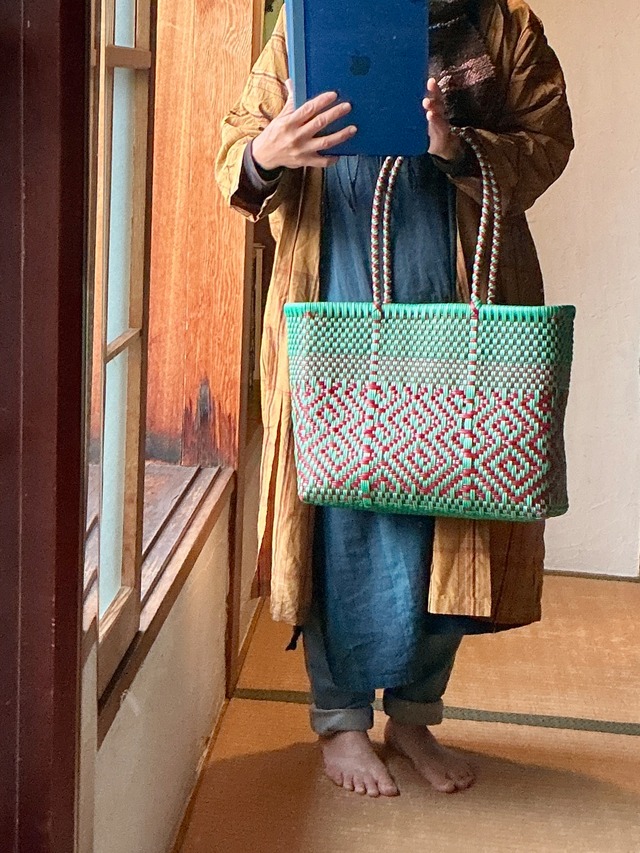 ヤマベボッサ中南米支部長が現地スタッフに依頼して、民芸品大国メキシコのTianguis(先住民の青空市場)で直接買い付けた、丈夫でカラフル、編み目の美しいメルカド(市場)バッグです。地元のおばちゃんはこの特大サイズのマイバッグで食材を買い出します。しかも必ず極上の模様とカラーリング。おばちゃんたちのバッグとエプロンにかけるお洒落ごころにはひれ伏したくなるゆえんです。 思い切り化学素材のメルカドバッグですが、丈夫で水濡れと汚れに強いのが魅力です。ショッピングにうれしい大容量。ピクニック、海、川、プールあそびなどにも最適です。たわしとせっけん水できれいに丸洗い可能。そして何と言っても色味のかわいさ♫ お出かけをウキウキさせてくれるアイテムまちがいなしです。 日本国内でも大人気のメルカドバッグですが、あまり出回っていないカラーをチョイスしました。赤×ミントグリーンのツートンカラーはまさに西瓜!なかわいさです。ちょっとそこまでの外出や、見せる収納としてインテリアを楽しくしてくれること間違いなし。おしゃれさんのファッションをさらに引き立ててくれる存在感のメルカドバッグ。オール1点ものですので、グッときたらお早めにどうぞ。 サイズ:タテ29.5㎝*ヨコ30㎝*マチ14㎝ 素 材:プラスティック ※デバイスやモニターの環境により色味が若干異なる場合があります。あらかじめご了承ください ※まれに収納したものに色移りする可能性があります。白っぽいポーチや小物などは避け、様子を確認しながら使ってください