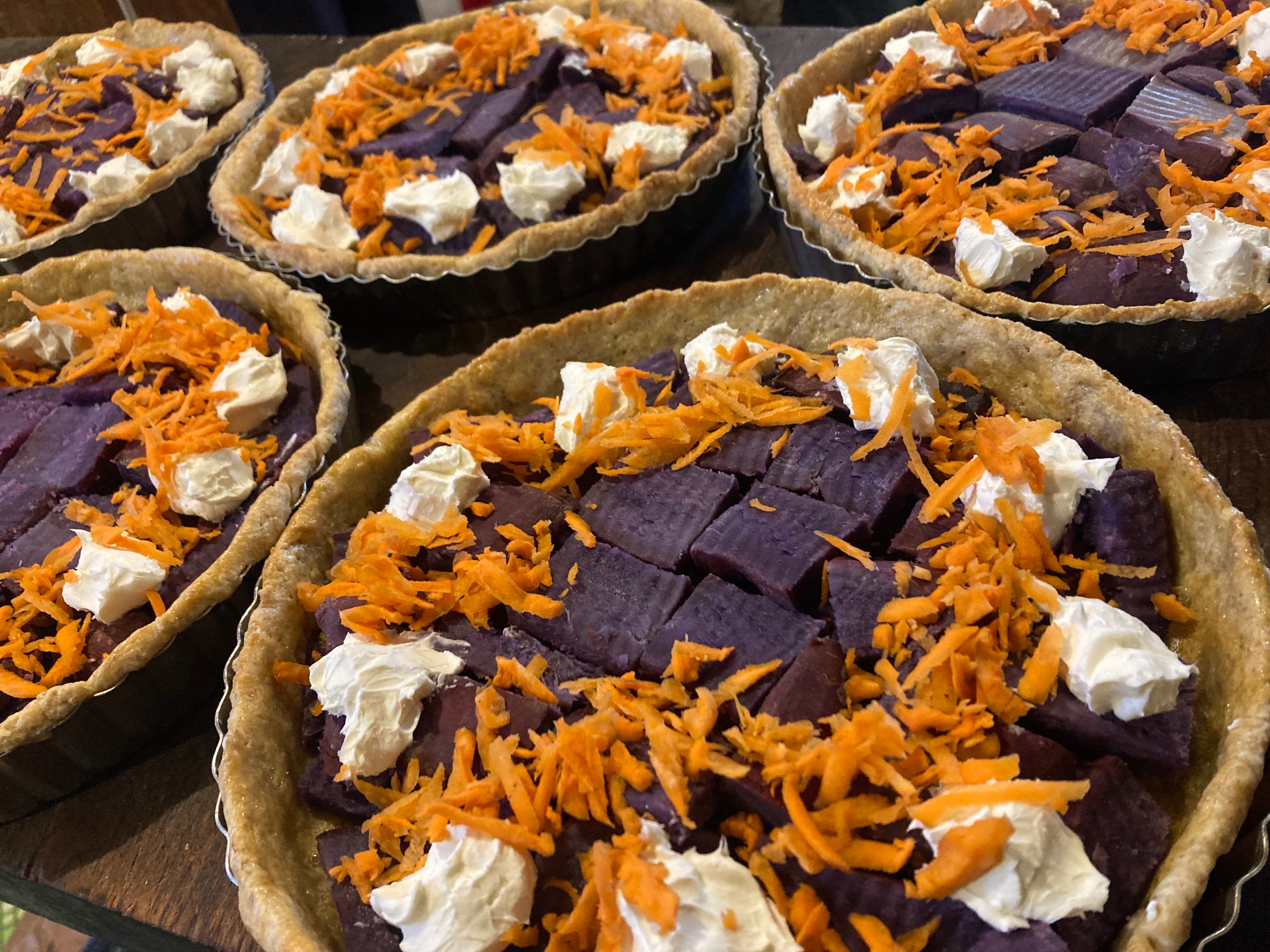 ざくホロのキッシュ地(パートブリゼ)にnonGM飼料&解放鶏舎で育てられた地産卵や、上質の北海道十勝産のフレッシュクリーム、信州産生乳100%の濃厚なアパレイユを流して焼き上げました。ほっくり甘いボッサ自然農園の希少な紫いも・福紫、香りのよいたべくら農園の有機キャロット、相性抜群のよつばクリームチーズを入れたキッシュです。目にも鮮やか&食べておいしい紫×白×オレンジのトリコロールキッシュは、年末年始の人が集まる季節に、また手土産や年始の備蓄食糧としてもご活用ください。12/31お届け商品です。